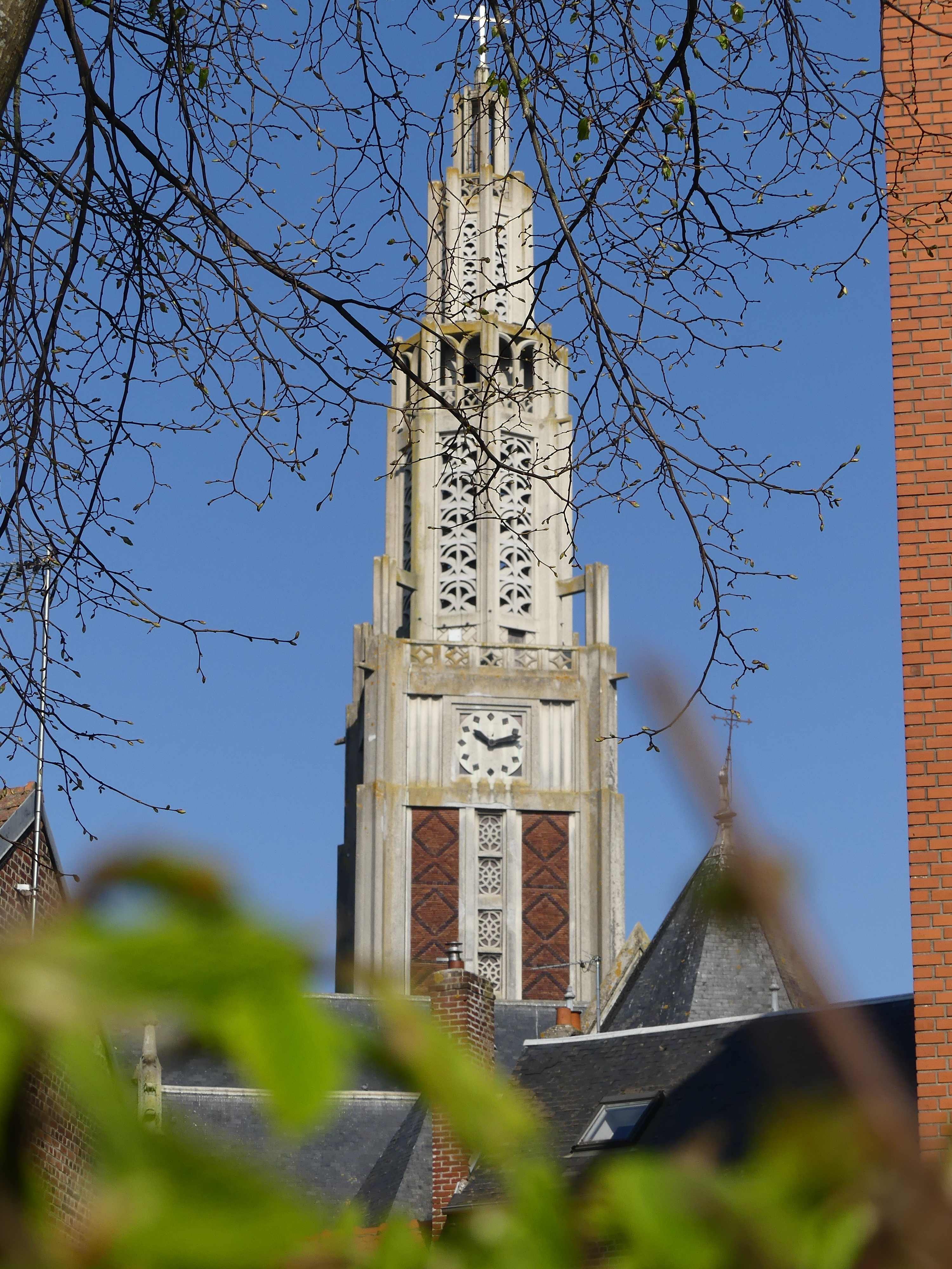 Le choeur a été restauré à l’identique ; la nef, le transept et le clocher sont contemporains, réalisés en béton armé avec des remplissages en panneaux de brique. Le clocher porte la croix à plus de 64 mètres de hauteur.